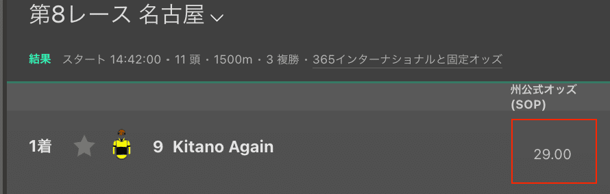 実際に競馬場で馬券を購入した場合のオッズは21.1倍、bet365では29倍と約8倍の開きがあります。