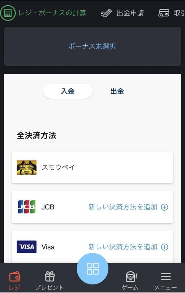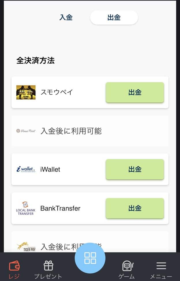 入金方法 銀行送金/スモウペイ/クレジットカード(VISA/JCB/MasterCard)/ヴィーナスポイント/アイウォレット/エコペイズ /タイガーペイ/スティックペイ/アストロペイ/マッチベター/パーフェクトマネー/仮想通貨