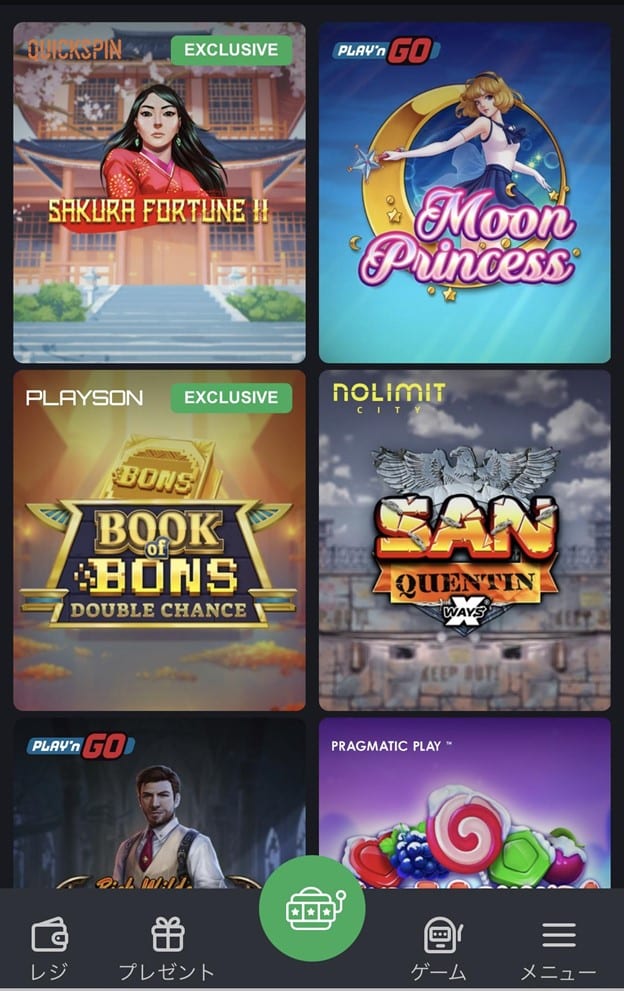 ソフトウェア 1X2 Gaming/2by2/4 The Player/Ainsworth/Amatic/BGaming/Bet2Tech/BetSoft/Big The Gaming/Bla BlaBla Studios/Blueprint/Booming Gaming/Booongo/Caleta Gaming/Dice Lab/EGT/Elk/Endorphina/Fantasma/Foxium/Gamatron/Gaming Corps/Gamomat/Genesis/Golden Hero/Green Jade/Greentube/HacksawGaming/High 5 Games/Igrosoft/Iron Dog/Kalamba Games/Lightning Box/Mascot Gaming/Max Win/Microgaming/Netent/Nolimit City/Northern Lights/OneToch/Oryx/PG soft/Plank/Play’nGo/Playson/Playtech/Pragmatic Play/Push Gaming/Quickspin/Rabcat/Realistic Games/RedRake/Red Tiger/ReelPlay/Relax Gaming/Ruby Play/STHLMGAMING/Spinoenal/Swintt/Thunderkick/Tom Horn/Wazdan/Yggdrasil/Evolution Gaming
