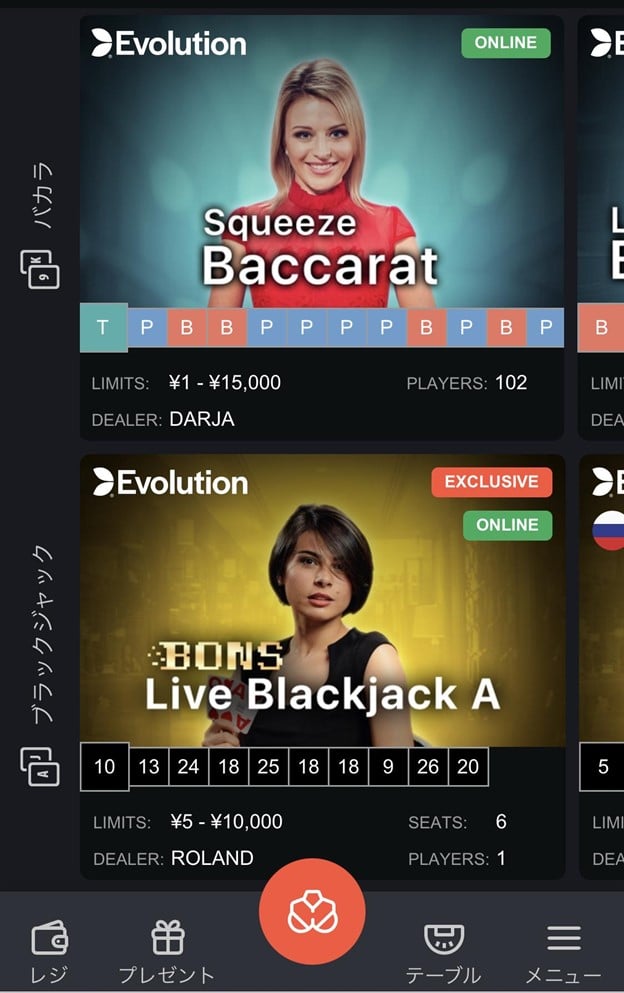 バカラとブラックジャックのテーブル数が圧倒的に多いのが特徴です。さらに空席のみを表示させたり最低ベット金額を設定したりと、便利な機能も備えています。