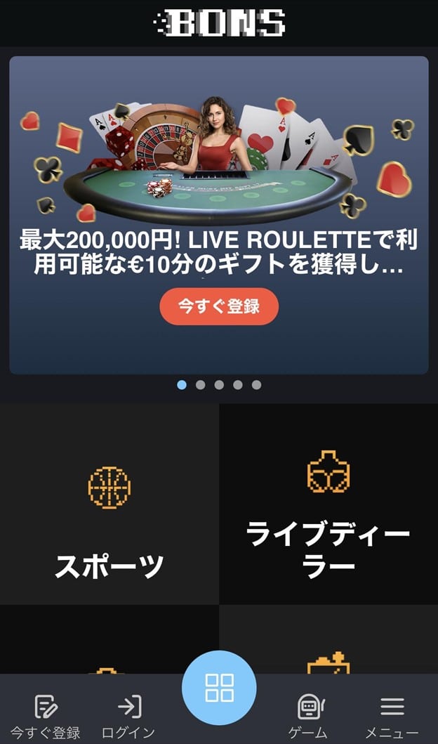 まずはボンズカジノ公式サイトを開きましょう。「今すぐ登録」とあるので、ここをタップします。