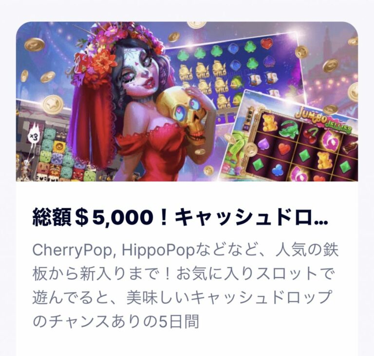 1月26日から1月31日までの5日間に開催されたキャンペーンです。対象のスロットでプレイして、賭け条件のないキャッシュドロップが総額5,000ドル分もらえるという内容です。