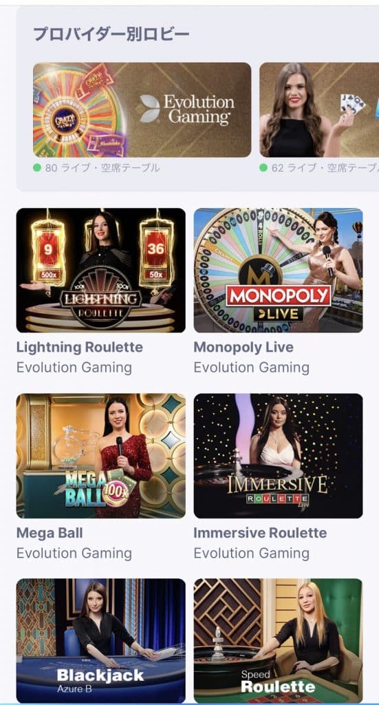 ライブカジノの数はゲームプロバイダーごとに次のようになっています。