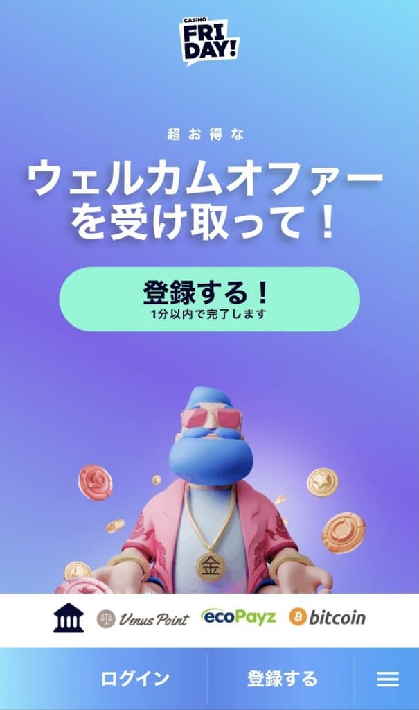 カジノフライデーには登録するだけでもらえる入金不要ボーナスと、入金すればもらえるウェルカムオファーの2つのボーナスが用意されています。