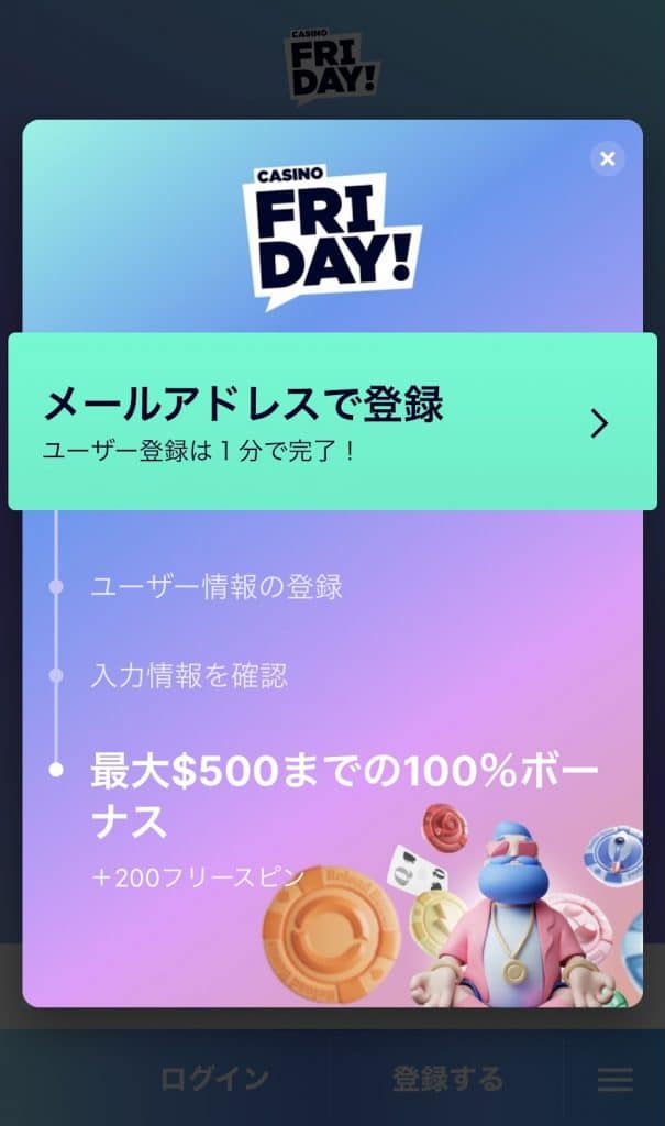 カジノフライデーへの登録手順を説明します。登録できるのは18歳以上となっています。