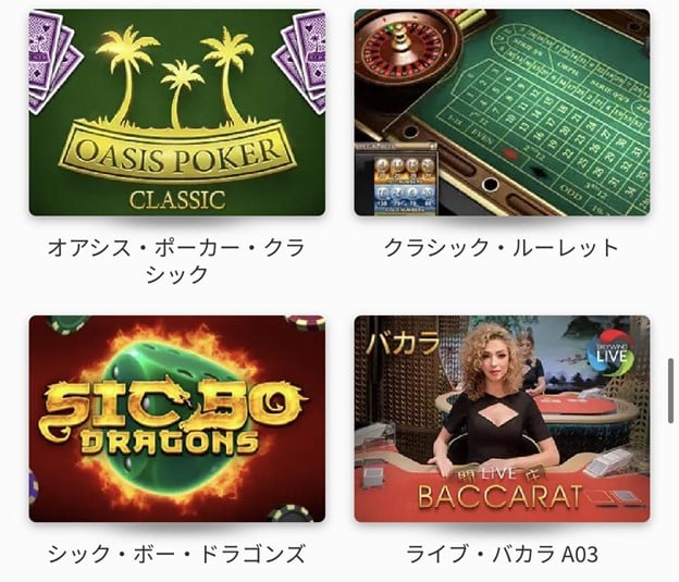 | テーブルゲーム | ルーレット/バカラ/ブラックジャック/ホールデムポーカー/ビデオポーカー/シック・ボー/メガ・ボール/ハイ・ロー/War/ドラゴン・タイガー/クラップス/アンダール・ババール/1000X BUSTA |