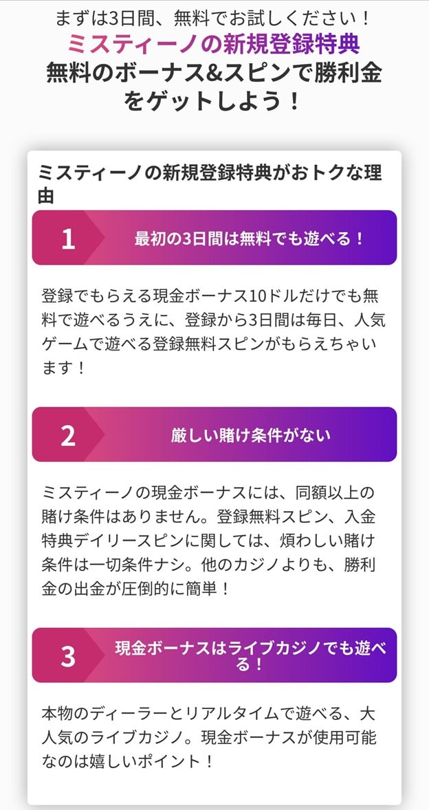 ミスティーノは毎日、入金特典のフリースピンを提供しています。出金条件も1倍の賭け条件とあって好評です。本人確認手続きをしなくてもある程度遊べる点も評価されています。そして公式に公表されているよりも出金が早いという口コミもあります。