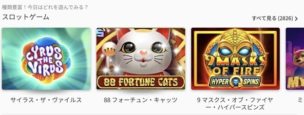 ミスティーノのスロットは2021年12月時点で2826種類とオンラインカジノのなかでもトップクラスの豊富さを誇っています。また高額賞金が当たるジャックポット機能付きスロットも36機種を用意しています。