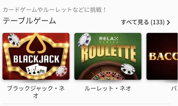 またデモゲームで無料プレイができるテーブルゲームに珍しくライブカジノのバカラやルーレットがあります。これはほかのオンラインカジノには見られないので、試しにライブカジノの雰囲気を楽しむことができます。