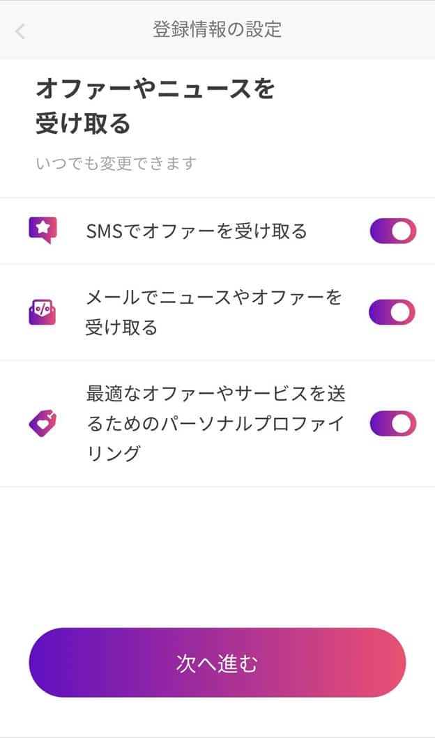 利用規約に同意し、オファーやニュースを受け取るかの選択をしたら手続き完了です。
