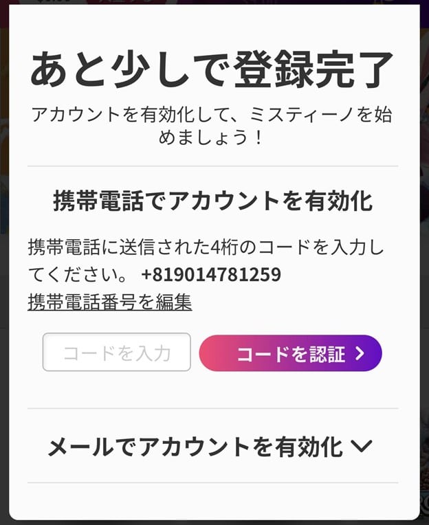 携帯電話の番号宛に4桁の認証コードが送られてくるので、コードを入力してアカウントを有効にしておきましょう。