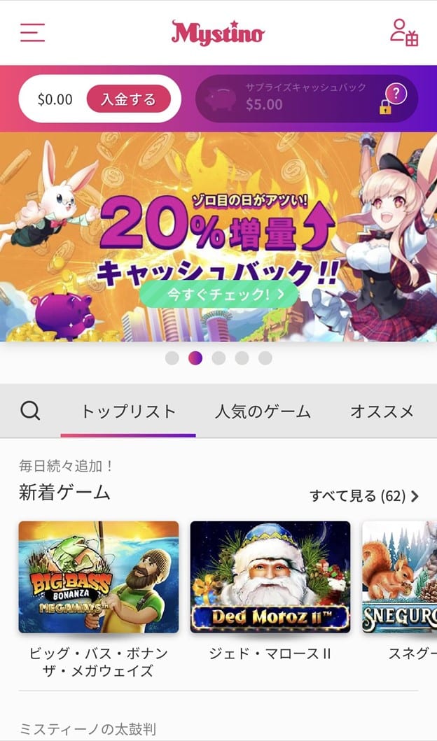 ミスティーノは日本人にも馴染みやすいサイトデザインであることが特徴です。オンラインカジノは海外企業によるサービスなので、使い勝手などが日本とは異なる雰囲気のサービスが少なくありません。その点、ミスティーノはアニメ調キャラクターを採用するなど敷石を低くしているので、誰でも構えることなく利用できると思います。