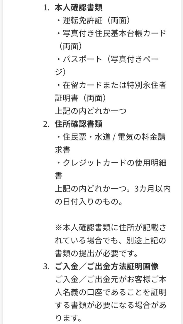 つまり、ある程度の入金と出金の実績ができるとメールにて本人確認の手続きを促されるということです。そして必要な書類として、次のようなものが挙げられています。