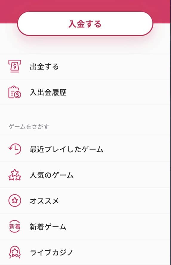 ミスティーノにログインし、画面左上のメニューボタンをタップしてメニューを開きます。「入金する」とあるので、ここをタップしましょう。