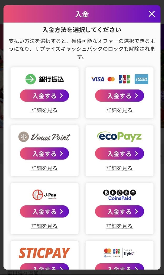 | 入金方法 | 銀行振込/クレジットカード(VISA/JCB/MasterCard)/ヴィーナスポイント/エコペイズ/J-Pay/スティックペイ/ジェットオン/マッチベター/仮想通貨 | |