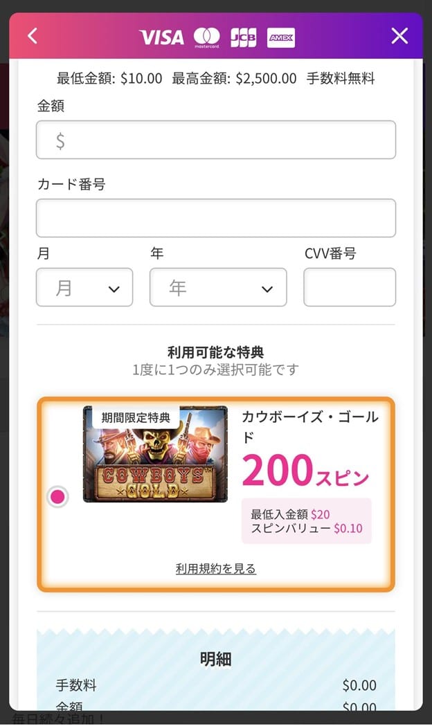 入金方法の選択画面が開くので、利用する決済方法を選びます。たとえばクレジットカードでの入金をするなら次の画面が開きます。ここで入金額とカード番号、有効期限とCVV番号を入力します。