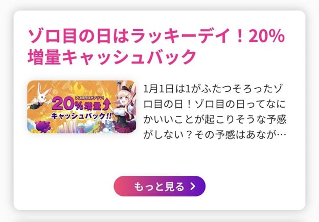 ミスティーノのサプライズキャッシュバックが20%増量されるキャンペーンです。キャッシュバックが当たってから7日以上獲得しなければ消滅するので注意しましょう。