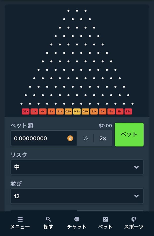 ステークカジノにはほかのオンラインカジノにはないオリジナルゲームを16種類用意しています。たとえば写真のゲームは、上からボールを落として下の倍率が書かれたところに落ちると、賭け金にその倍率を掛けて払い戻されるというものです。