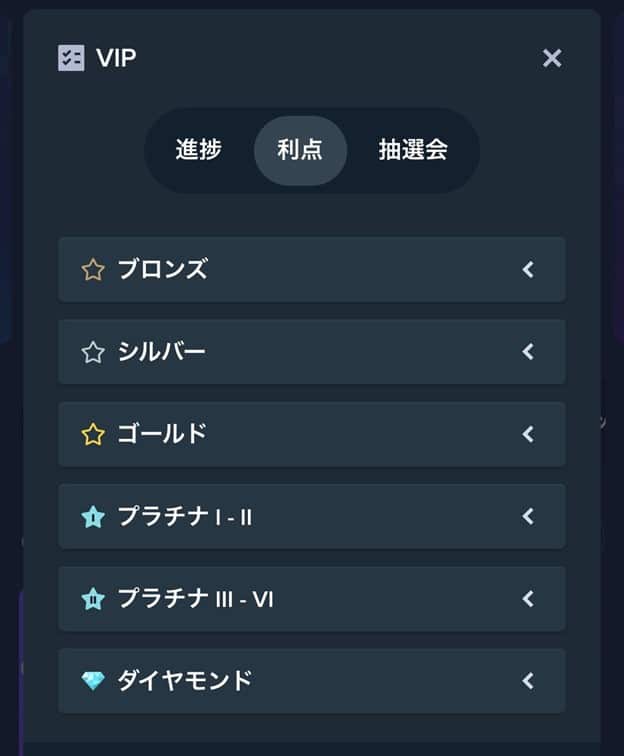 ステークカジノのVIPプログラムの内容は次のようになっています。VIPレベルはベット金額の総額によって上がる仕組みです。