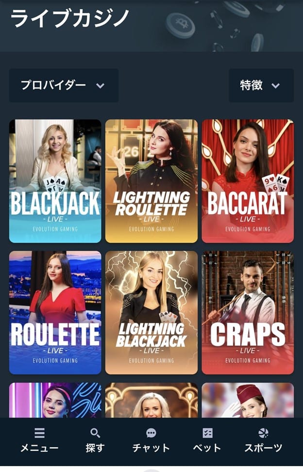 ライブカジノルーレット/バカラ/ブラックジャック/クラップス/シックボー/ドラゴンタイガー/カジノホールデム/カリビアンスタッドポーカー/3カードポーカー/キャッシュクラッシュ/クレイジータイム/メガボール/ダイス/ファンタン/ドリームキャッチャー/フットボールスタジオ