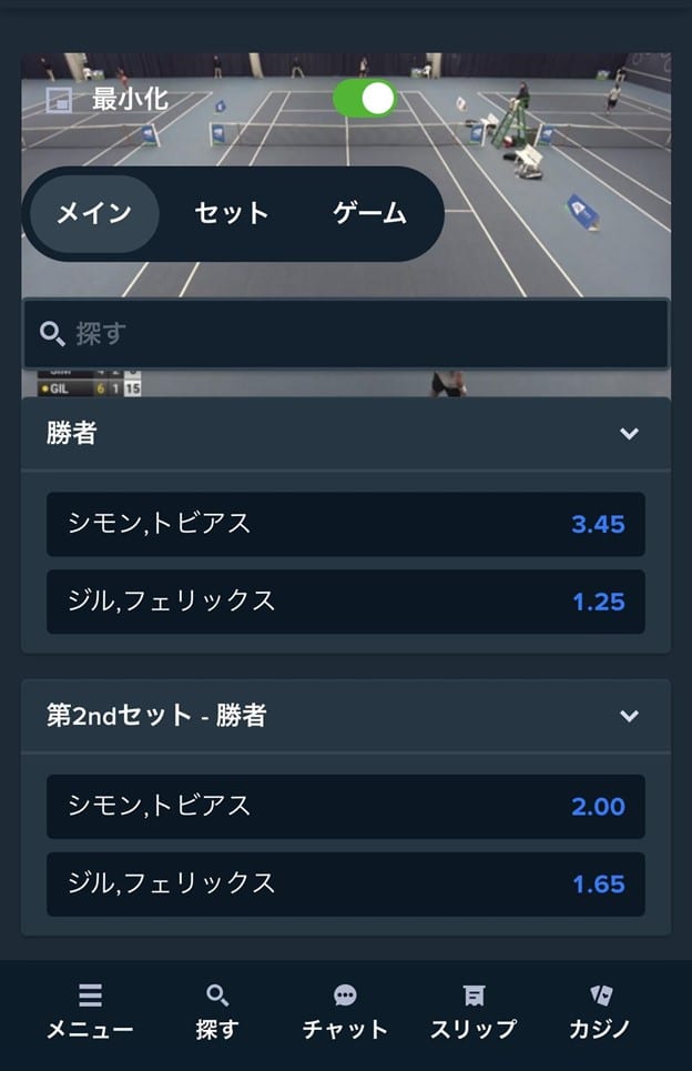 スポーツベットでは「ライブイベント」の試合でリアルタイムのベットができるようになっています。試合によってはライブ映像を見ながらベットできるので、試合を楽しむこともできます。