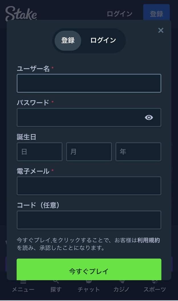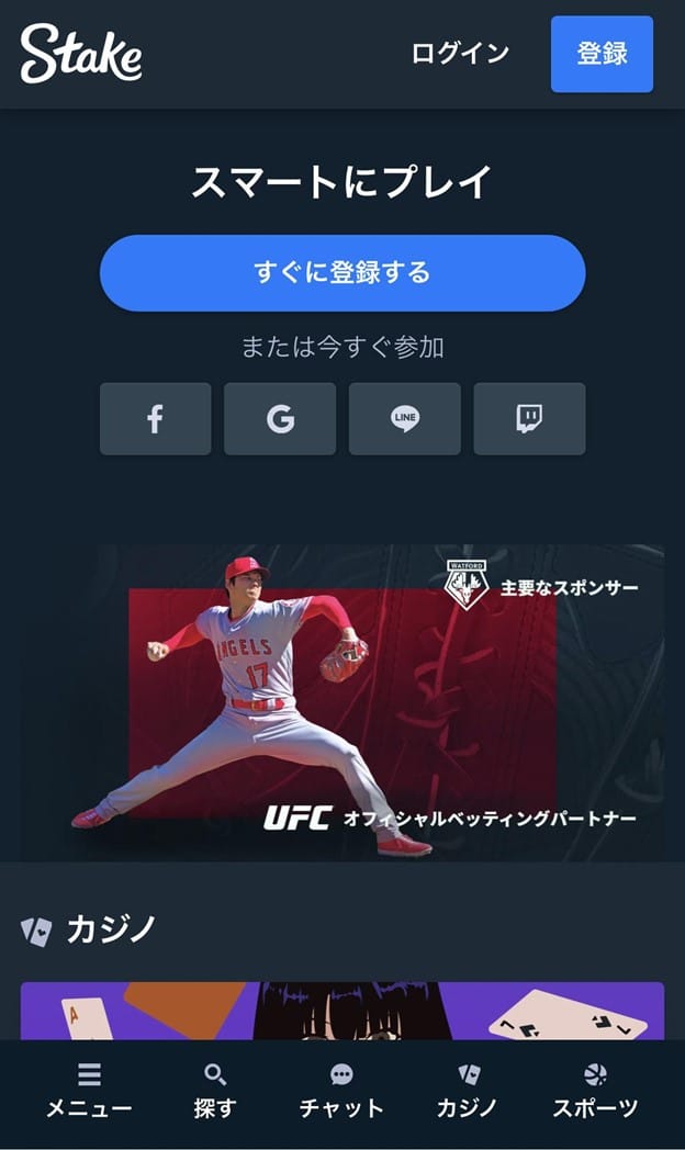 ステークカジノの公式サイトを開いて、画面上部にある「登録する」をタップします。
