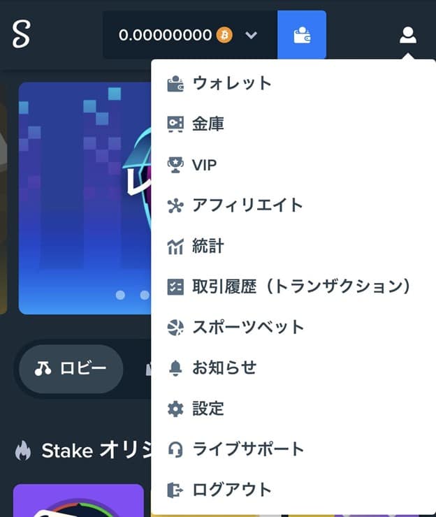 まずはステークカジノでログインし、画面右上のアカウントアイコンをタップしてアカウントメニューを開きます。