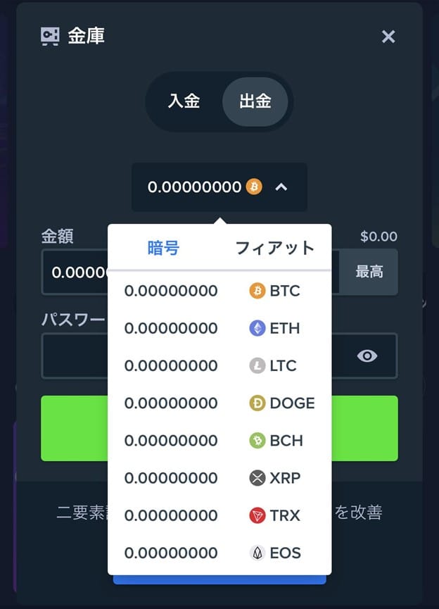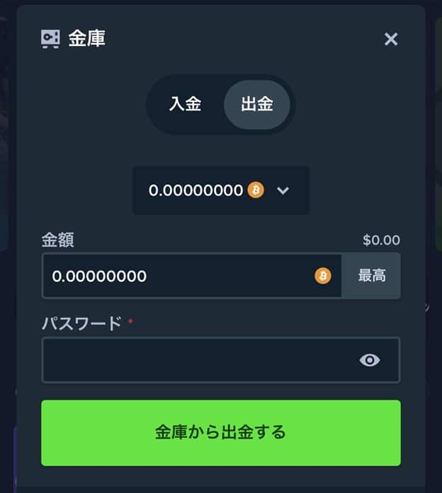 入金時と同様にアカウントから「ウォレット」を開けば、出金画面を開くことができます。あるいはアカウントの「金庫」からも出金画面が開きます。