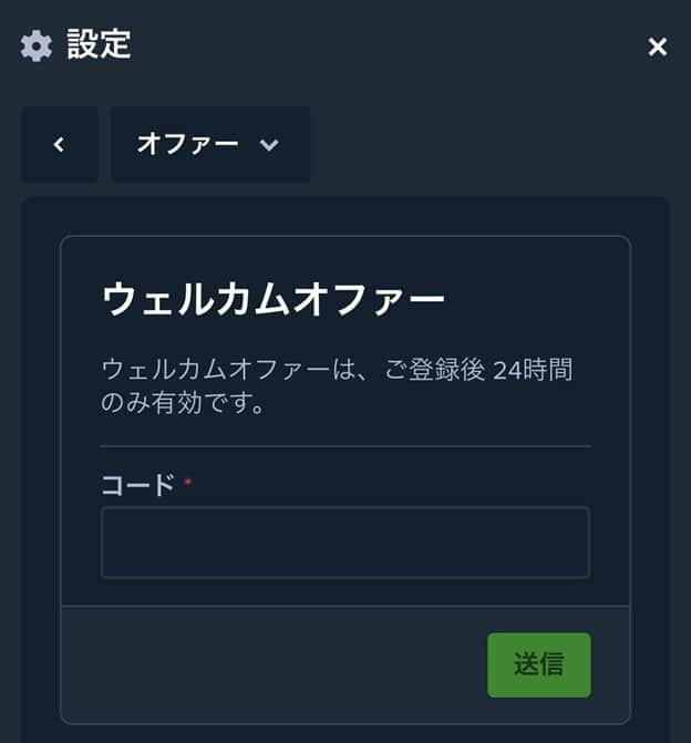 ボーナスコードの入力は、「アカウント」→「設定」→「オファー」で開く画面で行います。