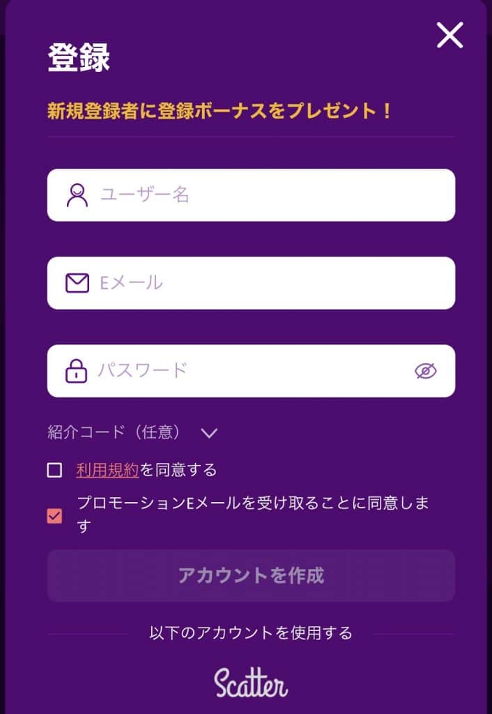 ユーザー名を選び、メールアドレス・パスワードを入力していきましょう。