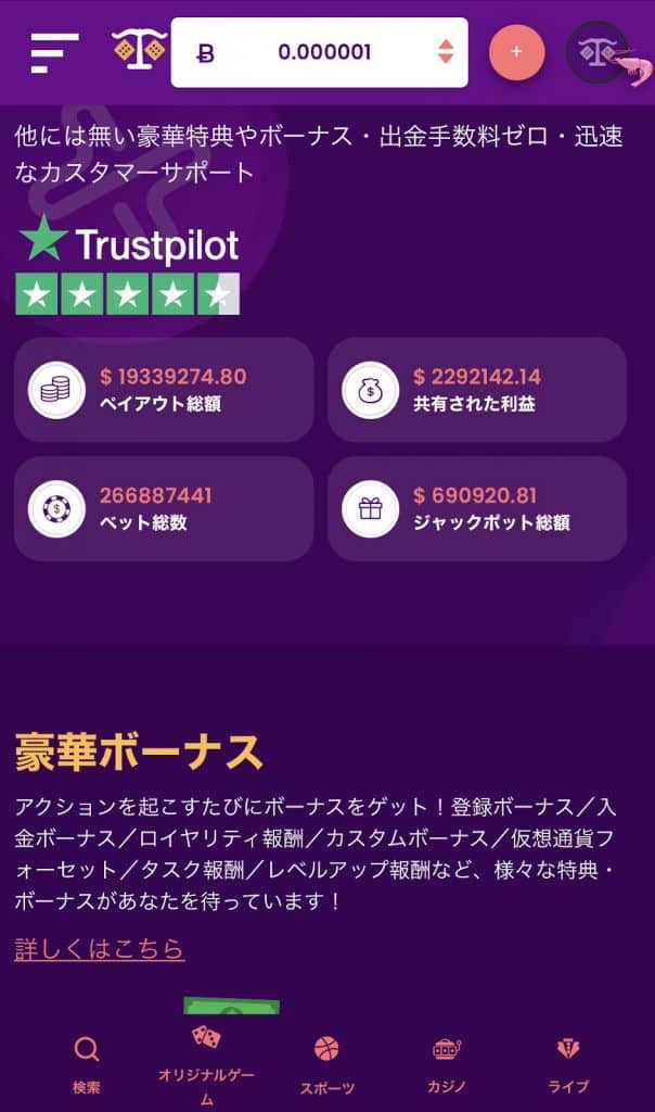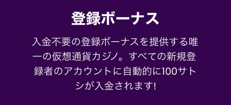 トラストダイスのアカウント登録をするだけで100サトシ(0.000001ビットコイン)もらえます。これはキャッシュとしてアカウントに入金されるので、正確にはボーナスではありません。