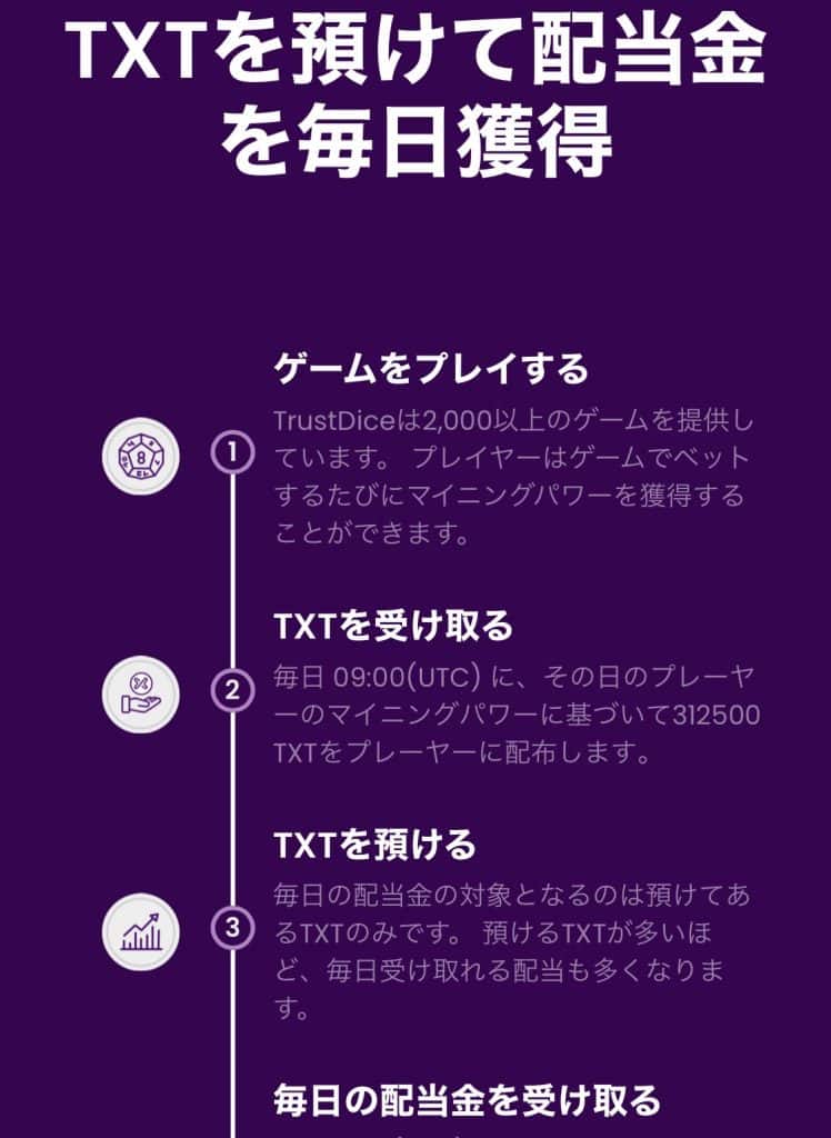 トラストダイスはゲームプレイによって独自の仮想通貨が貯まり、さらにそれを預けておけば配当を受け取ることもできます。つまりゲームを楽しみながら、仮想通貨を増やせるということです。