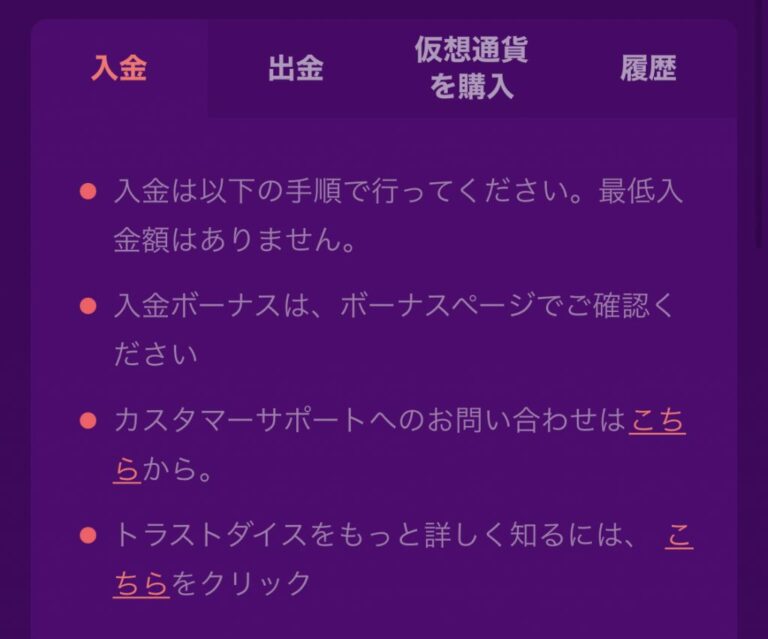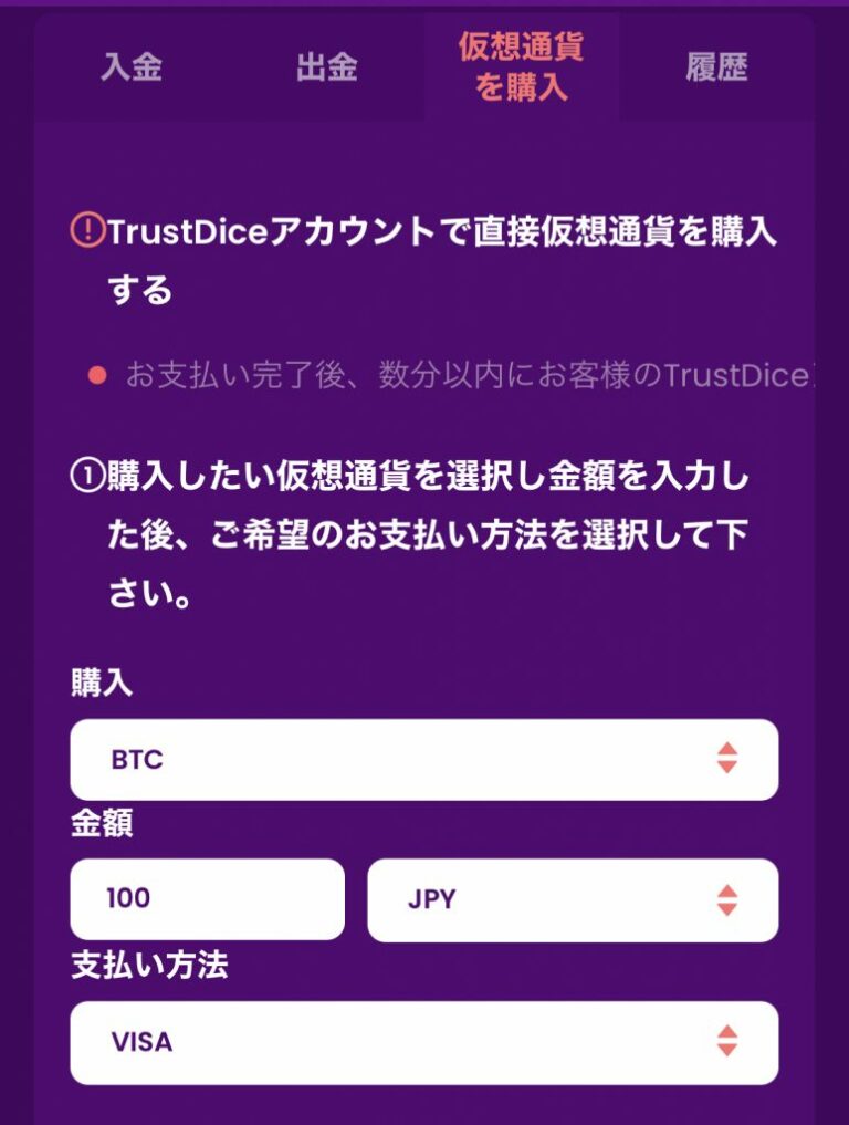トラストダイスでは仮想通貨を入金するだけでなく、購入することもできます。取引所で口座を作る必要なく、仮想通貨を保有できます。