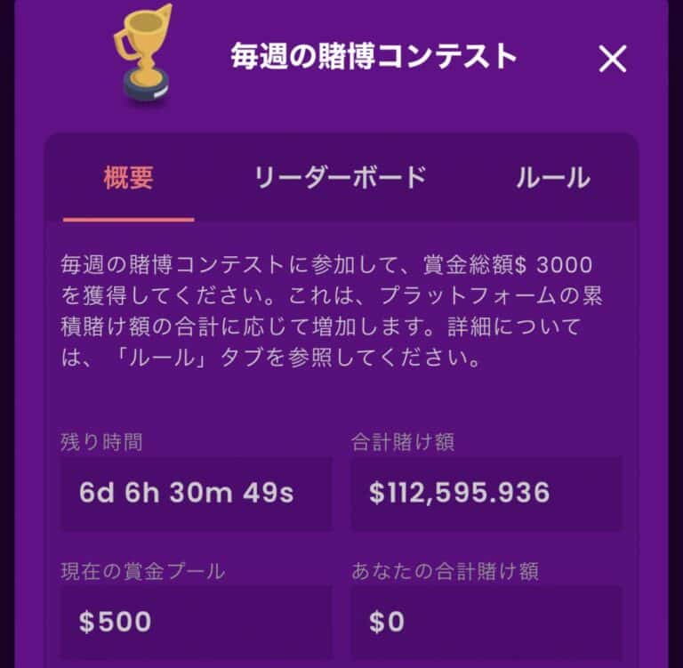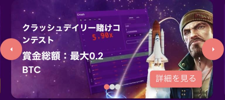 賞金総額最大0.2BTCの毎日開催されているコンテストです。オリジナルゲーム「クラッシュ」での賭け金総額に応じてランキングが決定し、上位のユーザーに賞金が出ます。