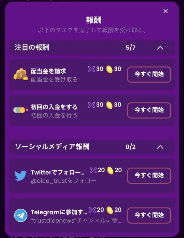 トラストダイスのTwitterをフォローすれば、毎週ビットコインのカジノボーナスを受け取ることができます。そのほかにもさまざまなタスクを完了させると報酬を受け取れます。